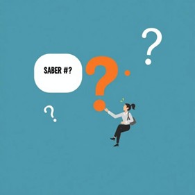 En el centro-derecha, se observa una figura femenina, sentada, vestida con camisa blanca y pantalón oscuro, que parece estar flotando o colgando de un gran signo de interrogación naranja. Ella extiende su brazo hacia una burbuja de diálogo que contiene el texto “SABER #?”. Además, hay varios signos de interrogación blancos dispersos en diferentes tamaños alrededor, lo que refuerza el concepto de cuestionamiento e incertidumbre.