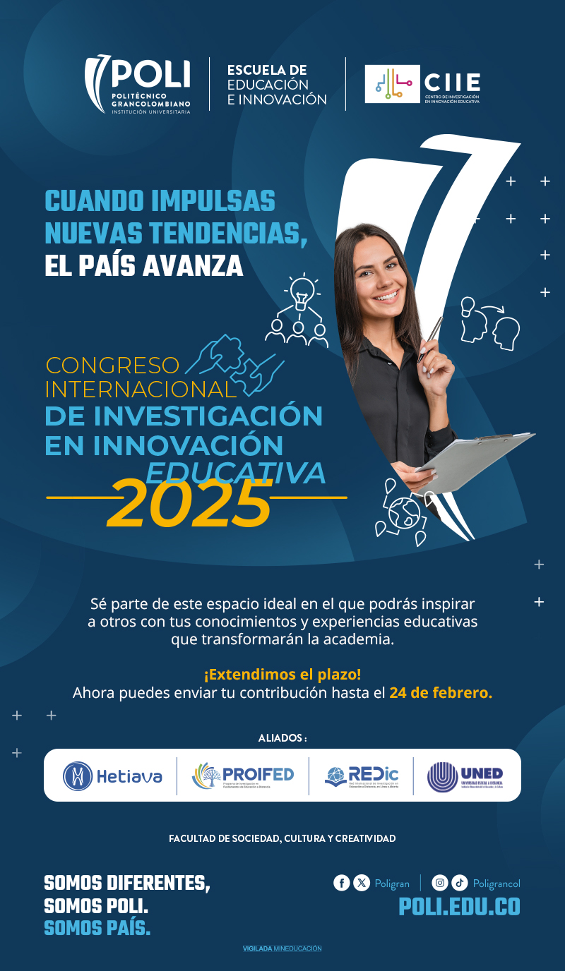 El Centro de Investigación en Innovación Educativa (CIIE) y la Escuela de Educación e Innovación del Politécnico Grancolombiano, tienen el gusto de invitarl@ a participar al Congreso Internacional de Innovación Educativa 2025, el cual se desarrollará del 8 al 10 de abril en modalidad híbrida.